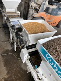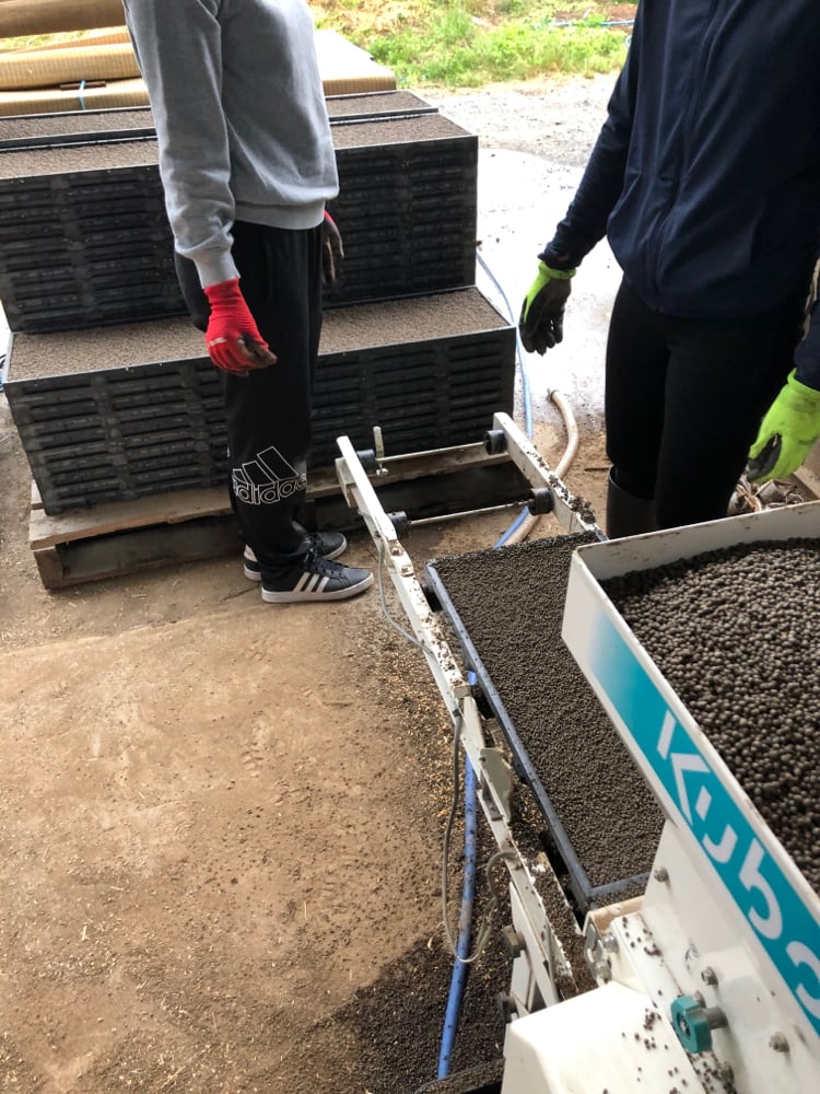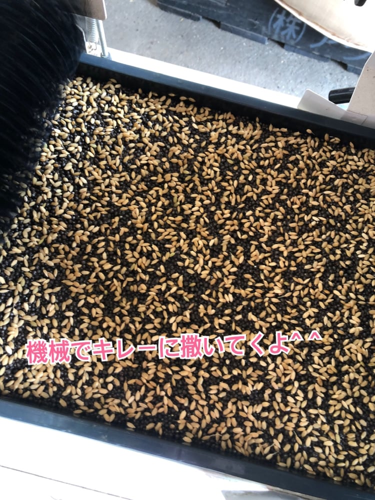 播種機と呼ばれる機械で苗箱に種を蒔いていきます