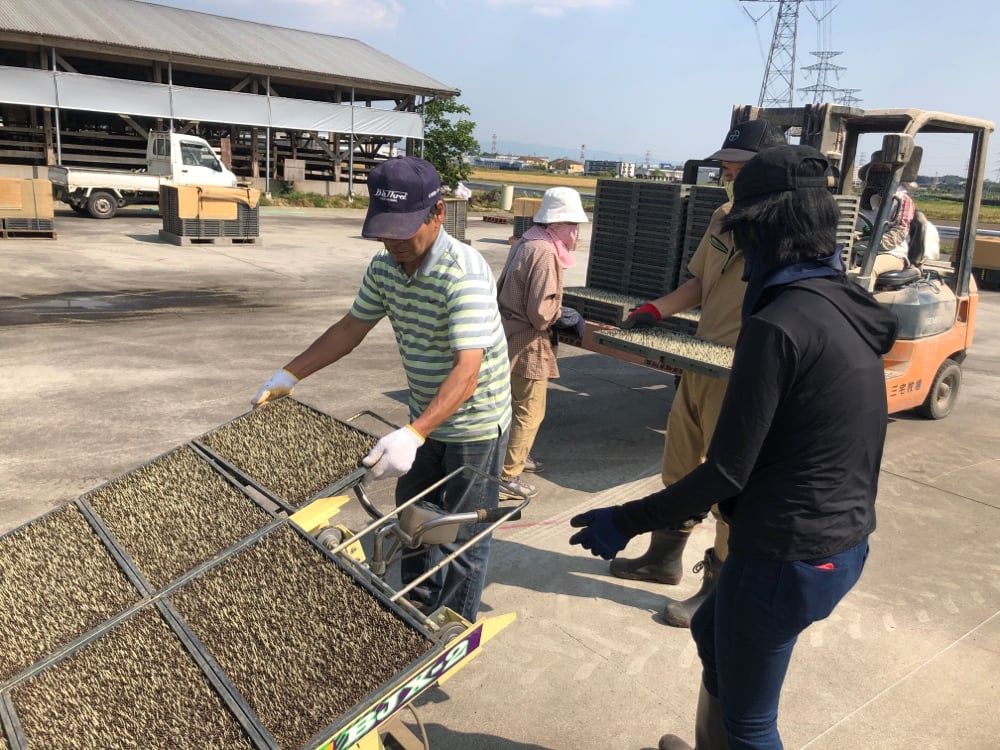 とても優秀な彼は、人間の腰が痛まないように代わりに苗箱をずらーっと並べてくれます。