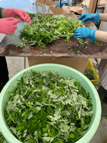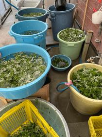 収穫したよもぎは、改めて人の目でチェックしていき、硬い茎やよもぎ以外の草、枯葉、黄色い葉などを除去