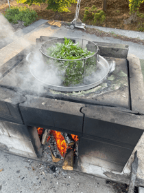 葉っぱが取り出しやすいように、寸胴鍋用のカゴに入れて炊いてます