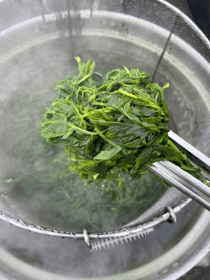 カゴにモリモリ入ってた葉っぱも、茹でるとこんなにちょびっとになります