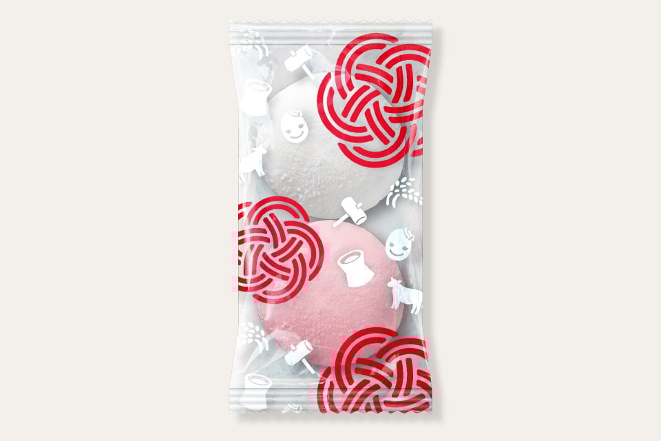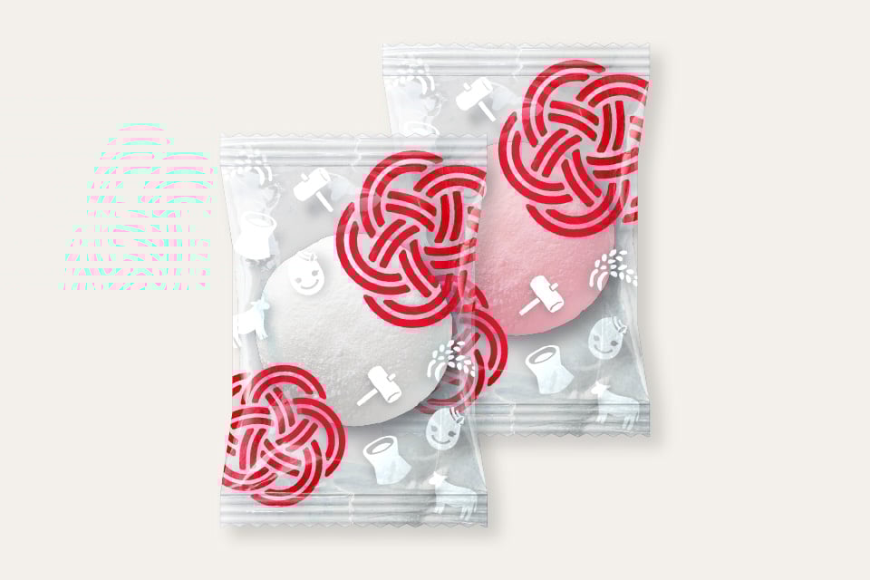上棟式等の催事の場が華やぐ紅白餅。イベントに応じて選べる「1個ずつ包装タイプ」と「紅白ペアの2個包装タイプ」の2種をご用意しました。イベント用のまとまった数でも、100個(または50組)単位で柔軟に対応可能です。